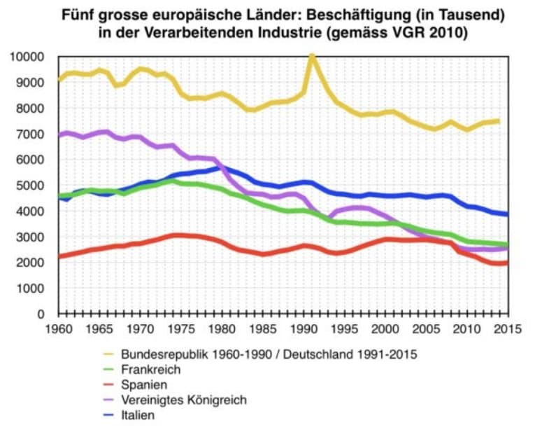 Mit Großbritannien teilt Frankreich die Entwicklung eines hochmodernen Dienstleistungssektors. Spezifisch französisch ist die Situation am Arbeitsmarkt, mit der jahrzehntelangen Jugendarbeitslosigkeit und der strukturell hohen Arbeitslosigkeit von rund 8-10 Prozent seit 30 Jahren. Die französische Atompolitik ist gescheitert. Sie wurde explizit so gestaltet, um mit konkurrenzlos niedrigen Stromtarifen der Industrie Wettbewerbsvorteile zu verschaffen. Doch die Industrie ist trotz unstreitig niedriger Tarife schwer unter die Räder geraten, auch dies eine Parallele zum Vereinigten Königreich.